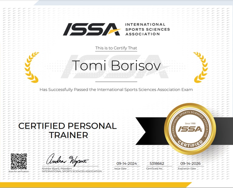 Здравейте! Аз съм Томи Борисов, роден на 20 юни 1996 г. в Пловдив, България. Сертифициран персонален треньор и консултант по хранене съм, с над 11 години активен опит в различни спортове и фитнес дисциплини. Започнах своя спортен път с тренировки по ММА, кикбокс, бокс и жиу-житцу и постепенно разширих уменията си в сферата на натуралния културизъм, функционалните и кардио тренировки.
