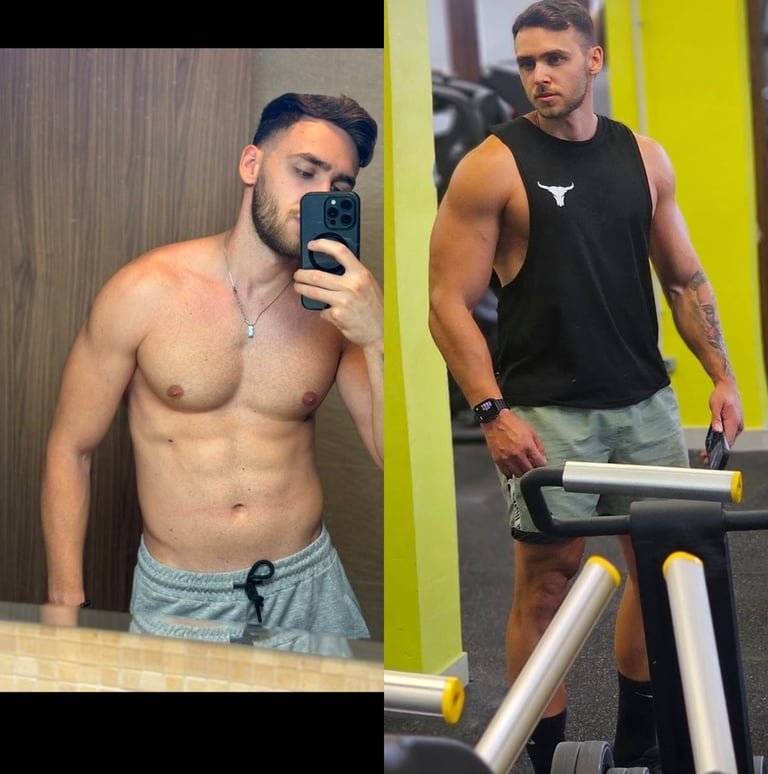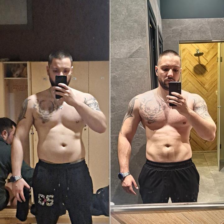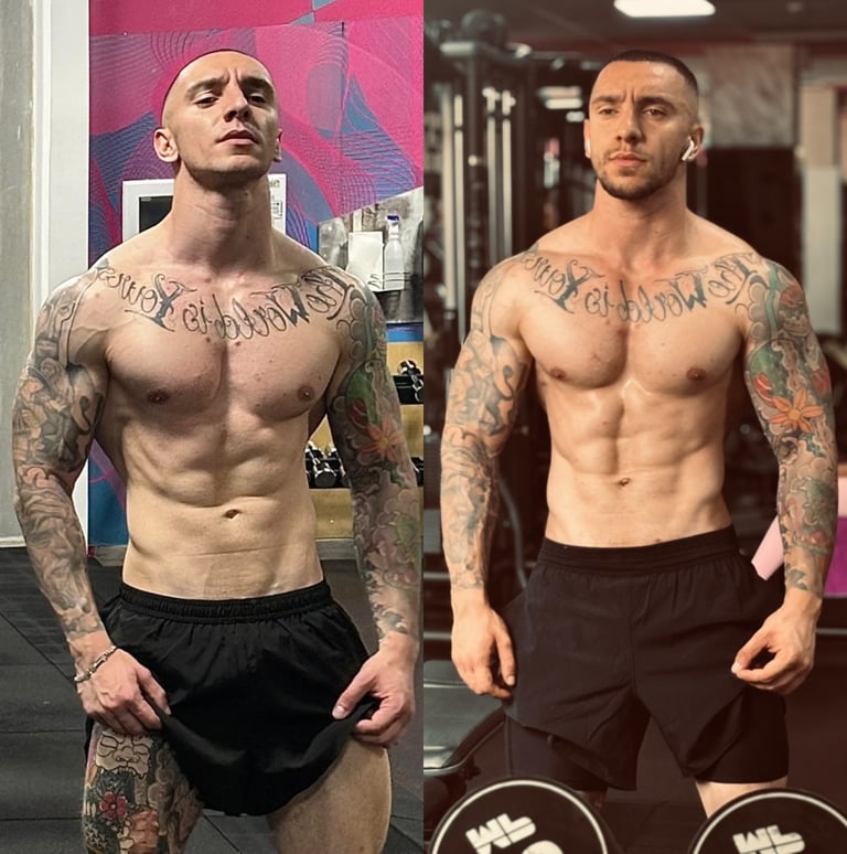 Крис дойде на крайен дефицит – под 2000 ккал при ~100 кг и тежки тренировки. Повиших калориите до ~3000, фиксирахме протеина и въведох седмични таргети по всяко упражнение (работни тежести, серии, повторения). Всяка седмица следях изпълнението, коригирах плана и надграждахме. Резултатът: отчетлива рекомпозиция – по-малко мазнини, повече мускул и силата рязко нагоре. Сега се храни повече, прогресира стабилно и има пространство за контролирано кътване — без крайности, в рамките на месечния 1:1 онлайн коучинг