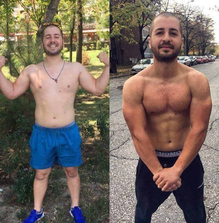 Ники : В рамките на нашия месечен 1:1 коучинг всяка седмица получаваше ясни таргети и корекции и следваше стриктно режима. За 3 месеца свали ~8–9 кг основно мазнини и изглежда по-мускулест от преди. Силата му нарасна осезаемо: от асистирани набирания −20 кг стигна до набирания с +15 кг на кръста със същите повторения, с прогрес и на кофички и всички базови движения. Това е резултатът от персонален план, отчетност и постоянство.